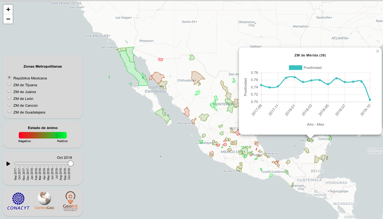 Positividad de usuarios de Twitter en las Zonas Metropolitanas de México de Septiembre de 2017 a Octubre de 2018.
